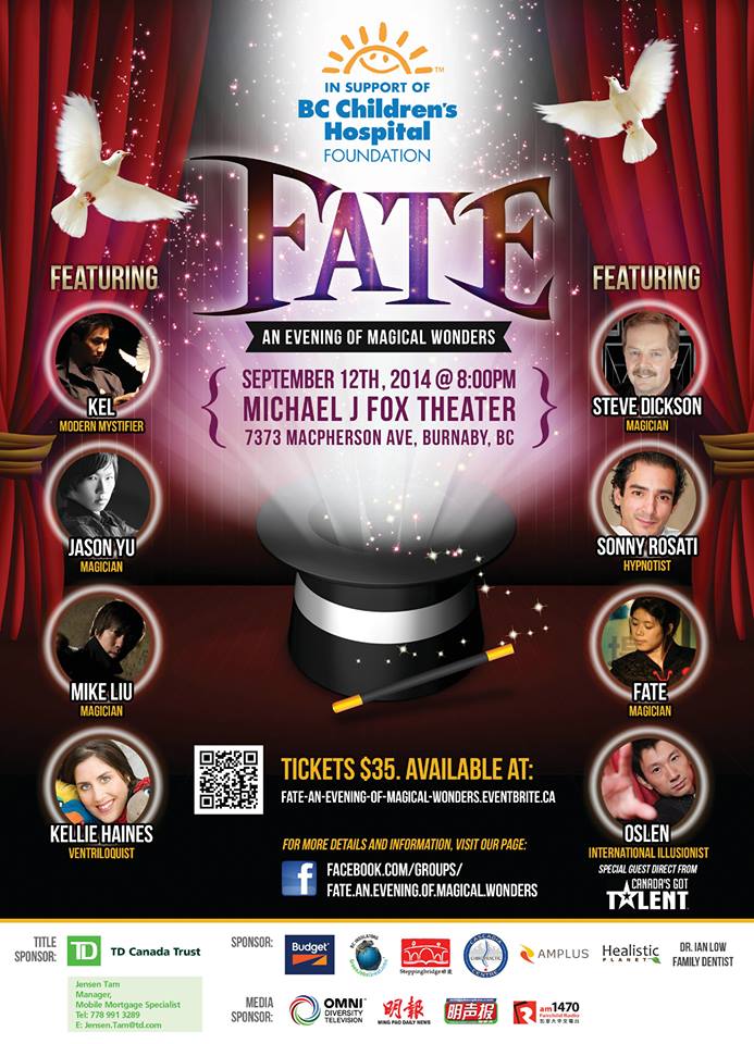 Gig Alert ! Posted on August 30, 2014 by sonny I’m still in Toronto but you guys know the drill.. always working – next Hypno-Show – Sept 12, 2014 – Michael J Fox Theater in Burnaby for The BC Children’s Hospital – if you drop by plz say hi – sending love around the world – S Share this: Click to share on X (Opens in new window) X Click to share on Facebook (Opens in new window) Facebook Click to email a link to a friend (Opens in new window) Email Click to print (Opens in new window) Print Like Loading... Related